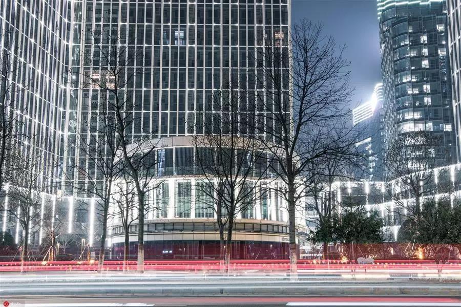 图为义乌市一处繁华的城市商业综合体夜景