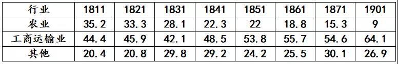 图为1801-1901年间英国各行业劳动力结构<单位:%>