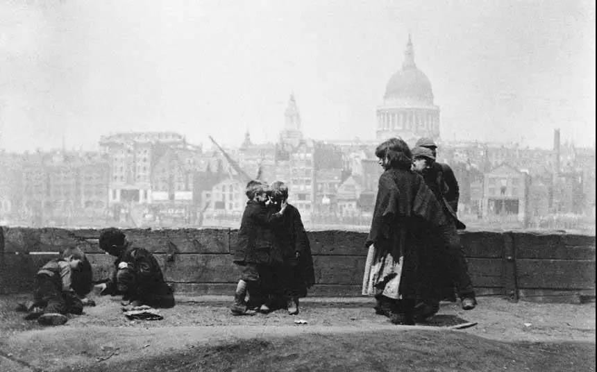 图为19世纪,孩子们在泰晤士河Southwark岸上玩耍,这里因肮脏的生活条件而被外界熟知