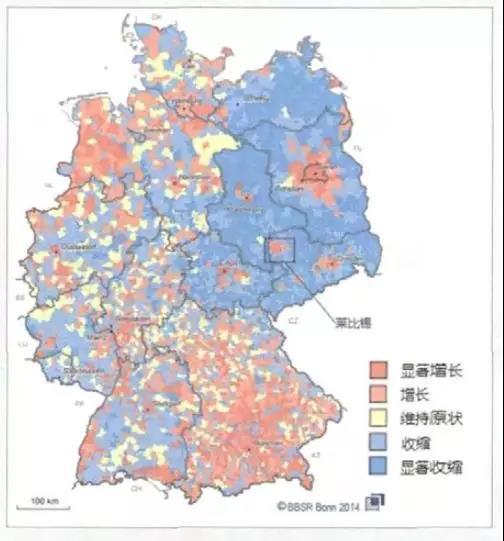图为2014年德国各区域人口增减情况,可以看出,莱比锡人口有显著增长