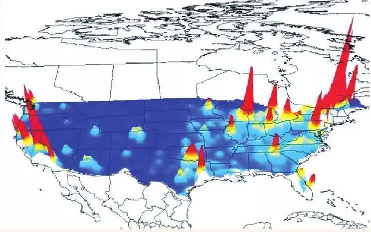 图中橙色区域占据了美国经济的半壁江山,但在人均GDP的意义上,各区域间却能实现“平衡发展” 图源:陆铭《大国大城》